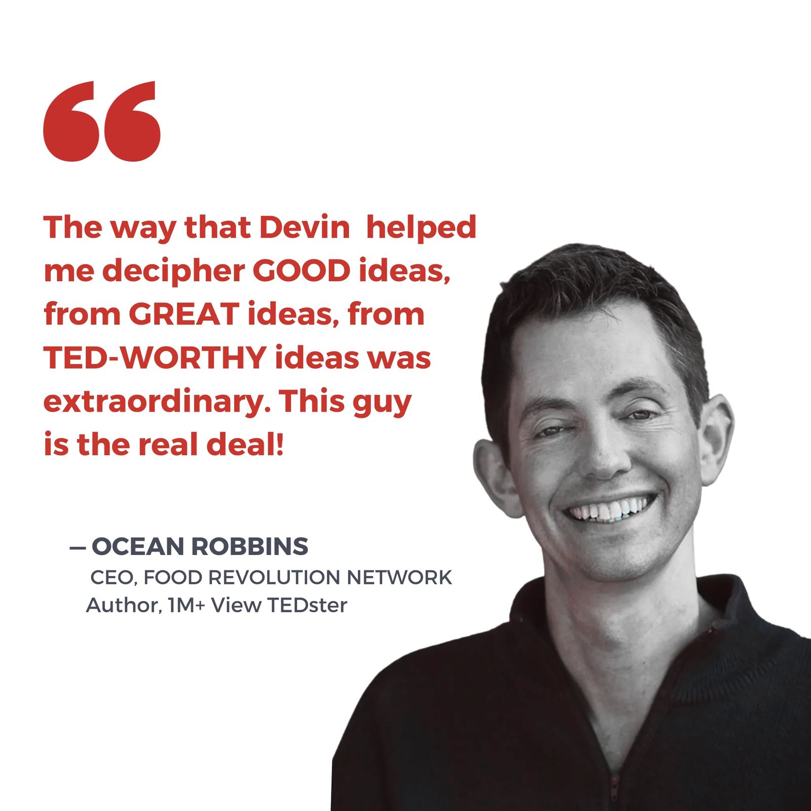 "What Devin's clients like me love is that his ambition is my success. He’s a true servant-leader: Everything he brings to his coaching is geared to help you realize your goals. His highest ambition is snapping that photo of you holding the summit flag — your center stage standing ovation!"