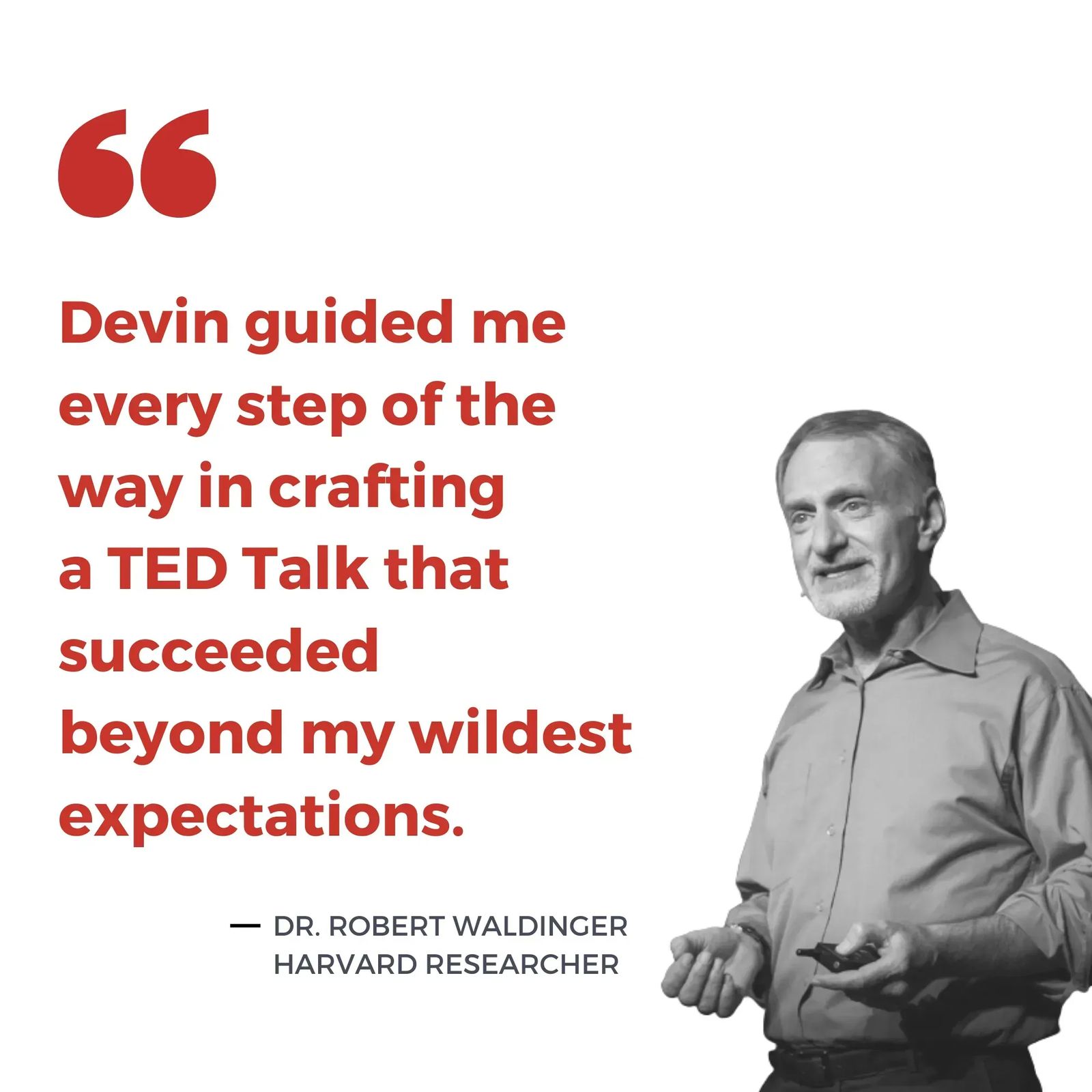 "I can't believe my great luck in finding Devin Marks. He guided me every step of the way in crafting a TED talk that succeeded beyond my wildest expectations—it's now been seen on TED.com by more than 1.5 million people, in less than seven days time!